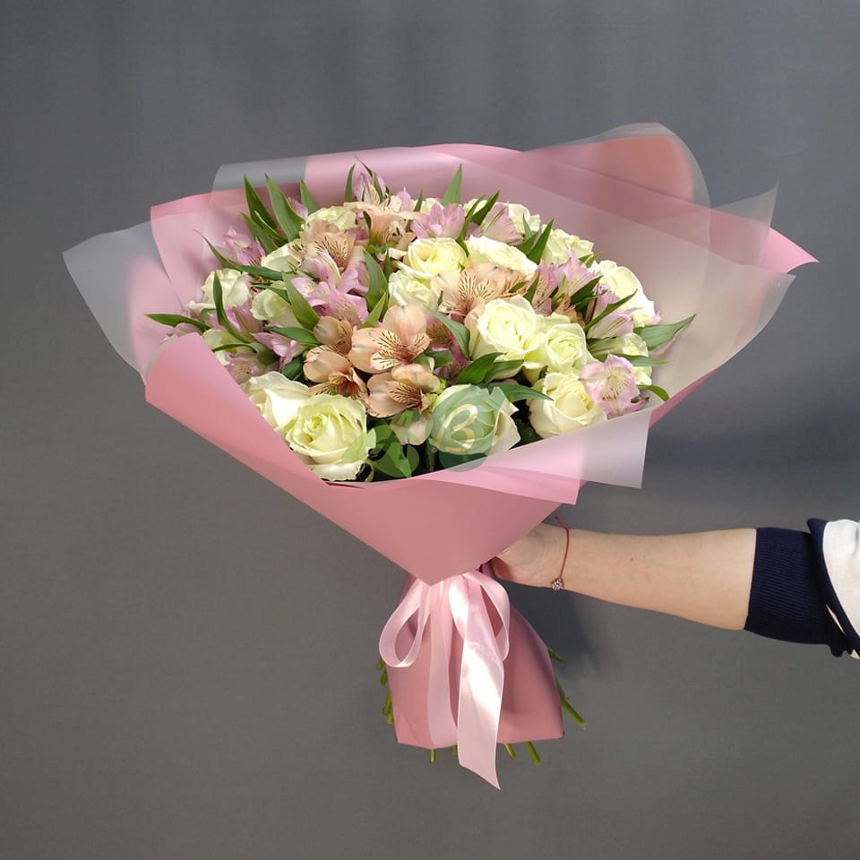 Изящный букет “Парижанка” – это свежие белые розы и розовые альстромерии в композиции на заказ с доставкой. Благодаря объемности роз и альстромерии этот букет нельзя назвать маленьким.